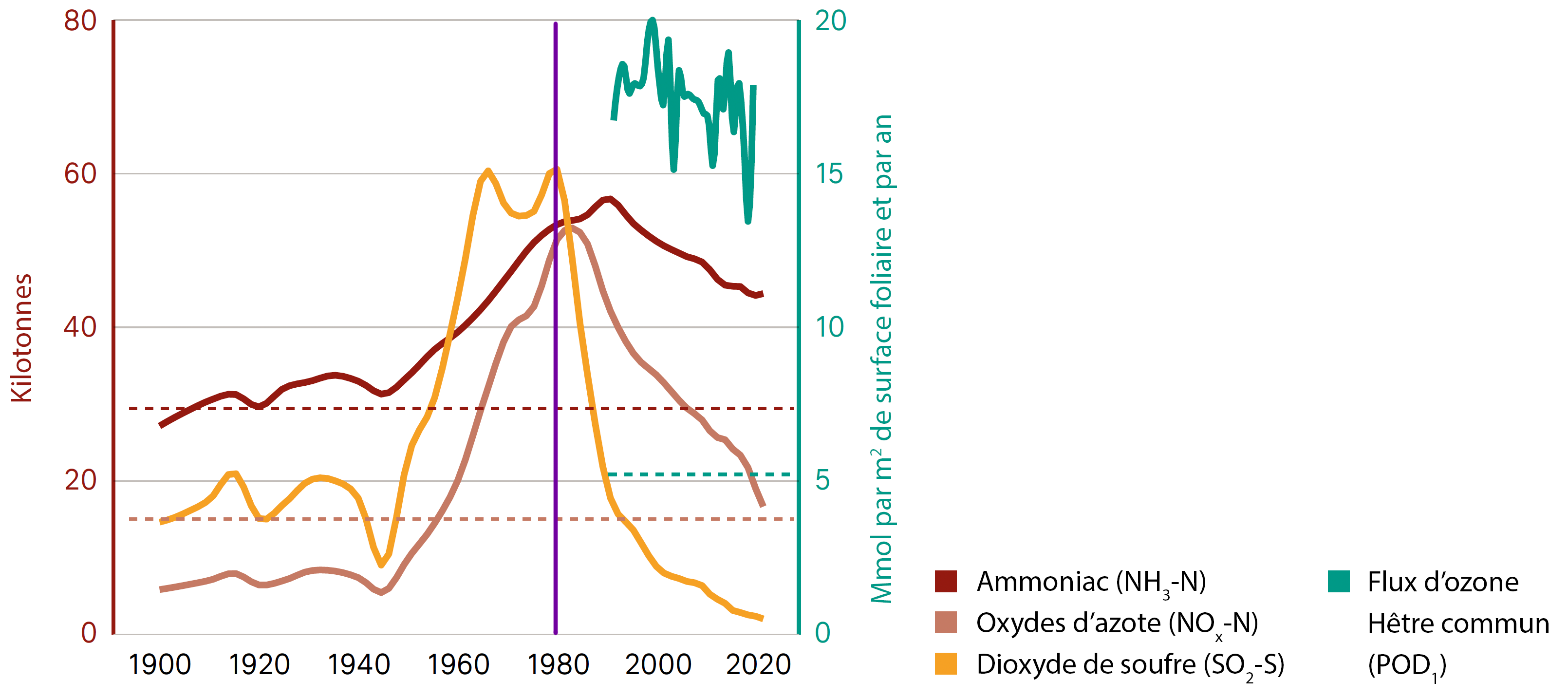 Fig. 6. Émissions de polluants atmosphériques de 1900 à 2020 et évolution du flux d’ozone (POD1) pour le hêtre (en vert) Les traitillés indiquent les valeurs cibles selon la stratégie de protection de l’air du Conseil fédéral de 2009 pour le NOx et le NH3, et selon les charges critiques de la CEE-ONU pour l’ozone.