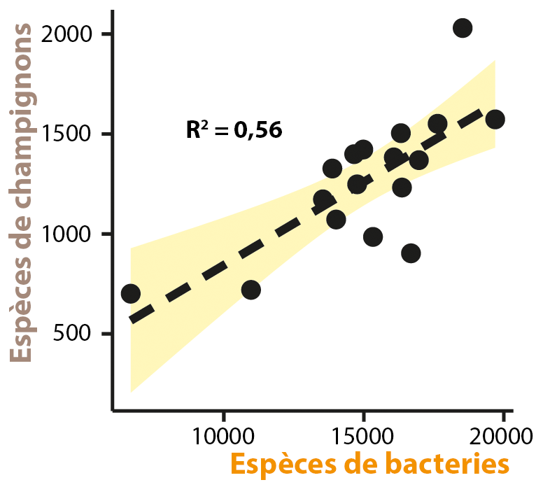En outre, ces relevés effectués sur des sites LWF indiquent que la diversité des champignons et des bactéries dans le sol forestier est corrélée (fig. 10): sur les sites où se trouvent de nombreuses espèces de champignons, la diversité bactérienne est également élevée. Cependant, le nombre d’espèces de champignons et de bactéries peut également être élevé sur des sites ne comportant que quelques espèces végétales. Cette relation est importante pour la pratique forestière, car les deux groupes assument des fonctions centrales du sol, par exemple dans le cycle des nutriments, la formation d’humus ou la défense contre les pathogènes. Une grande diversité microbienne renforce la santé du sol et augmente la résilience de la forêt face au stress hydrique et à d’autres risques.