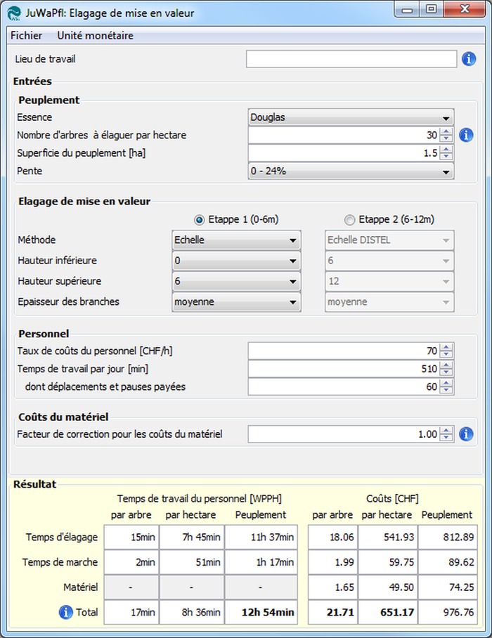 La figure 2 montre l'interface utilisateur graphique en utilisant l'exemple du modèle de l’élagage de mise en valeur. Les interfaces utilisateur de tous les modèles sont, par principe, structurées de la même manière. Dans la partie sur fond gris, les paramètres d’entrée sont saisis dans les champs ou sélectionnées dans les champs déroulants. Dans la partie inférieure sur fond jaune apparaissent les résultats pour les temps et les coûts pour des différentes positions importantes ainsi que les totaux. Les temps et les coûts sont généralement indiqués par unité (arbre, ouvrage etc.) ainsi que par surface. Au simple changement d'une variable d'entrée, les résultats sont automatiquement mis à jour. De cette façon, l’influence d’une certaine valeur d’entrée sur les temps et les coûts peut être vérifiée rapidement et facilement.