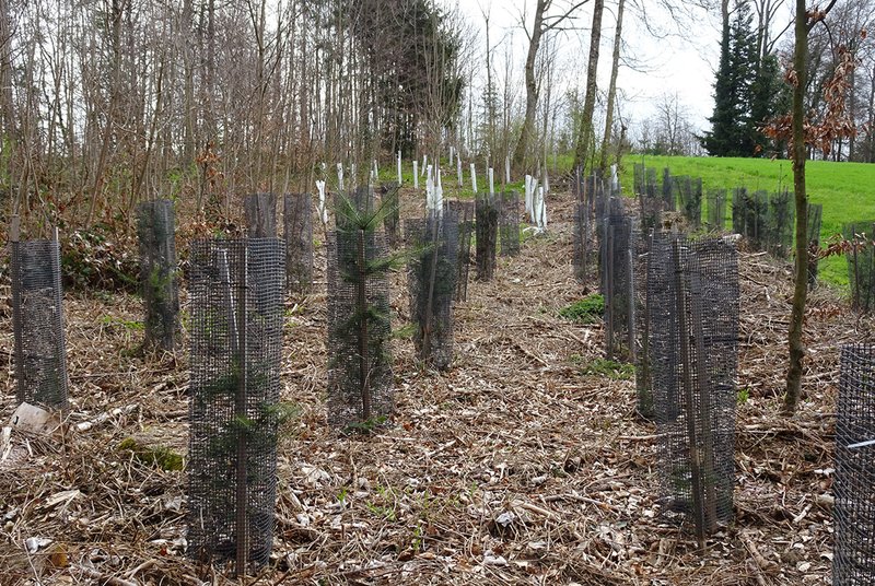 Fig. 1: Des plantes protégées contre l'abroutissement par une mesure de protection individuelle. Les coûts d’un tel travail peuvent être rapidement estimés à l'aide du nouveau logiciel JuWaPfl. Photo : Fritz Frutig, WSL