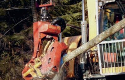 Fig. 2 - Le mât de l’installation n’étant pas fixé au bras, le Combi-Yarder peut valoriser le bois avec le processeur pendant que le câble-mât est en service. Photo : Abächerli Forstunternehmen AG