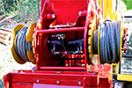 Contrairement aux câbles-mâts existants, le mât n’est pas monté sur la partie pelle, mais sur le châssis de la machine. Cela permet d'utiliser cette dernière comme processeur pendant l’intervention. Par comparaison avec les autres systèmes, il en résulte un gain de temps tant au niveau du transport que du traitement. Gros avantage du mât fixé au châssis : pendant le fonctionnement du processeur, le câble ne doit pas être détendu et peut donc tourner en parallèle. Il est d'ailleurs également possible de démonter le mât et d’utiliser la machine comme un processeur ordinaire.