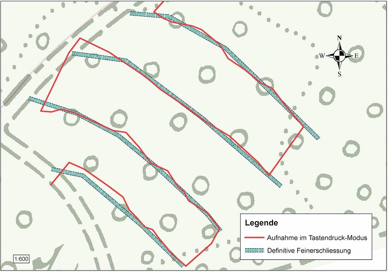 Les essais pratiques ont rapidement démontré que les relevés de terrain fonctionnent bien et ce, en dépit d’un degré de couverture élevé. A l’issue d’une phase d’essai intensive, durant laquelle nous avons testé différentes méthodes de relevé sur le terrain, il s’est avéré que les relevés manuels (en pressant sur une touche) étaient les plus adaptés: un point de coordonnées est enregistré lorsqu’on appuie sur la touche correspondante. L’opérateur peut ainsi être attentif au degré de couverture et peut aisément éviter des obstacles. De plus, des intersections importantes, des virages ainsi que la fin d’un layon de débardage peuvent ainsi être relevés de manière précise.