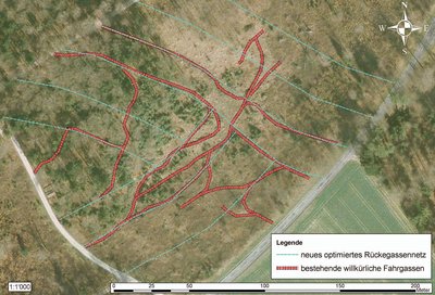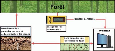 Cependant, les moyens techniques modernes, comme le GPS (Global Positioning System – système de positionnement par satellite) ainsi que les logiciels de géoinformatique, ont éveillé en nous l’idée de chercher un procédé de recensement rationnel, bon marché et qui se laisse facilement intégrer aux travaux sylvicoles quotidiens. Cette idée fut le point de départ du développement d’un système de recensement simple, grâce auquel les layons de débardage sont relevés pendant les travaux ordinaires, pour être ensuite sauvegardés durablement sous la forme de cartes digitales dans un logiciel SIG (système d’information géographique). Le projet revêt également un aspect de sécurité au travail, puisque les données de base relevées constituent des éléments qui peuvent être consultés rapidement, non seulement pour la protection des sols, mais aussi pour l’organisation des coupes.