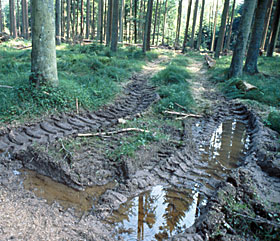 Fig. 2 - Ornières d’ampleurs diverses en forêt. Elles provoquent des modifications profondes et durables du sol, qui altérent d’importantes fonctions pédologiques. Photo : Ecologie des sols WSL
