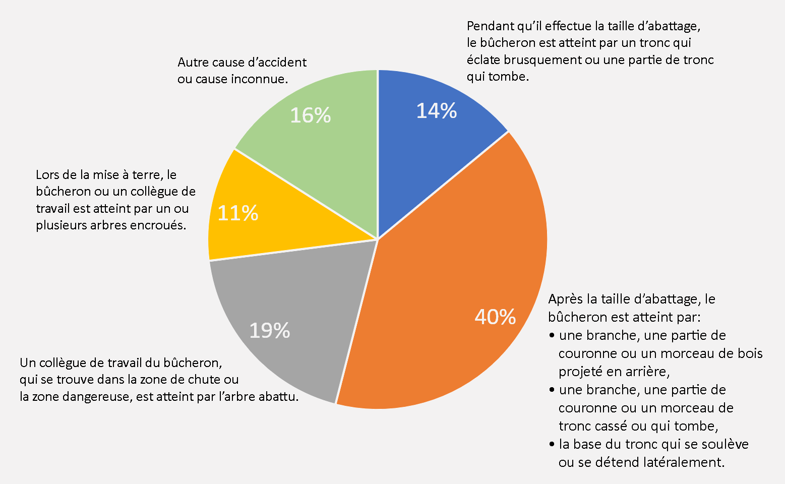 Les travaux d’abattage comportent des risques particuliers: entre 1991 et 2004, ils ont occasionné 73 accidents mortels. Cela représente 40 % des accidents professionnels mortels en forêt. Selon les statistiques, les principales causes d’accident sont les suivantes: