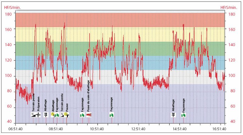 Dans ce contexte, nous avons enregistré les fréquences cardiaques de quatre forestiers-bûcherons pendant une journée entière de travail au moyen d’un système de mesure emprunté au domaine du sport. Ces hommes étaient constamment observés et le moment précis ainsi que la durée de chaque activité typique ont pu être relevés avec une précision de l’ordre de la minute. Ces activités étaient par exemple la marche, la préparation, l’aménagement, l’utilisation du coin d’abattage, l’abattage, le façonnage, les interruptions, les pauses, etc.