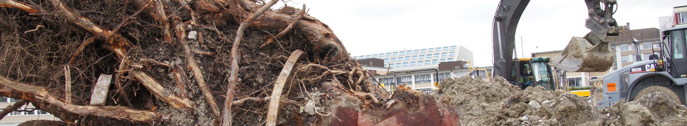 Fig. 1 - Au printemps 2013, un dendrochronologue du WSL a aperçu par hasard des vieilles souches qu’une pelleteuse avait déterrées dans un chantier de construction. Photo: Gottardo Pestalozzi (WSL)