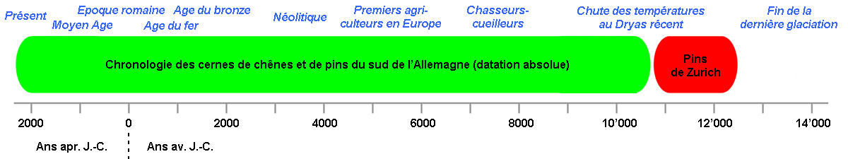 Au cours des dernières décennies, des dendrochronologues allemands avaient reconstruit pour l’Europe Centrale une chronologie de cernes remontant à 12 594 ans (cal BP), soit jusqu’à l’an 10644 avant J.-C. Les souches découvertes en 1999 ont alors permis aux chercheurs de l’Institut fédéral WSL et de l’Institut de Géographie de l’Université de Zurich de construire une nouvelle chronologie, plus ancienne, pour la période allant de 12 700 à 14 300 avant le présent (cal BP) (fig. 4).