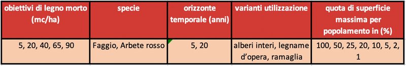 Al fine di coprire un ampio spettro di possibili obiettivi, sono stati sviluppati vari concetti di legno morto, partendo dalle combinazioni delle seguenti variabili di controllo (v. tabella 1), definite a livello di popolamento boschivo: