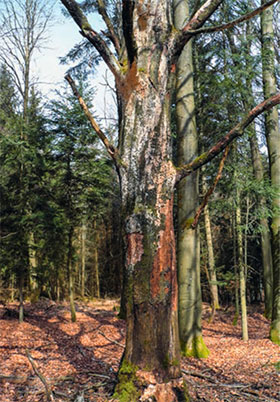Fig. 2.Gestioneattiva del legno morto: albero di faggio così come si presenta quattro anni dopo un intervento di cercinatura. Foto: Peter Langhammer
