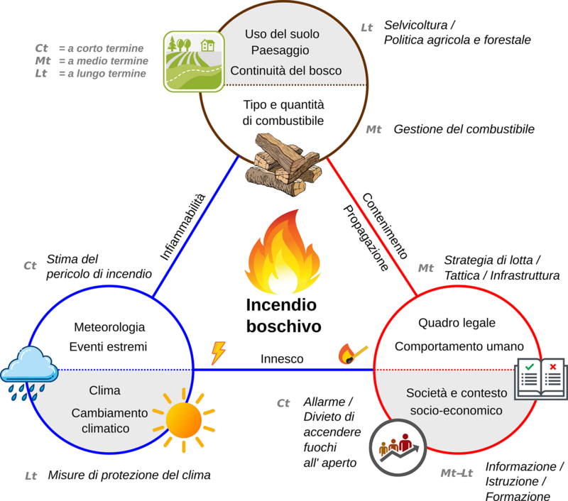 Il regime degli incendi è determinato dal clima, dalla vegetazione, dalla topografia, dalle fonti di accensione e dalla capacità di estinzione. Mentre la topografia non può essere influenzata, i fattori climatici e umani hanno un'influenza significativa, sia a breve che a lungo termine. In particolare, gli esseri umani hanno una forte influenza attraverso l'uso del suolo, la gestione della vegetazione e la legislazione. In Svizzera, l'esempio del Ticino mostra come il cambiamento nell'agricoltura e nella gestione del territorio può cambiare la frequenza degli incendi e come le misure politiche e organizzative possano ridurre il rischio (fig. 8).