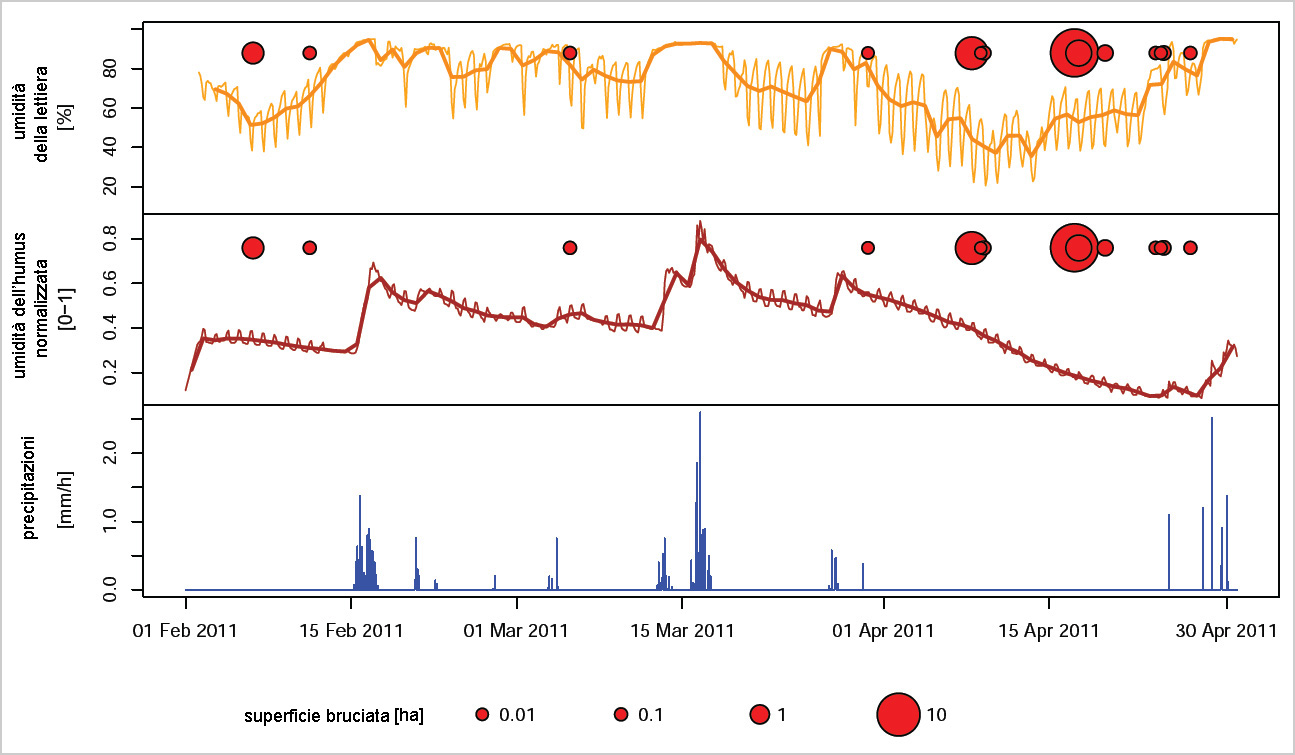 Fig. 4 - Andamento delle precipitazioni, dell’umidità degli strati di humus e della lettiera in un castagneto e relativa frequenza degli incendi boschivi nel Canton Ticino per lo stesso periodo. Incendi boschivi nel Canton Ticino (punti rossi, con dimensione proporzionale all’area boschiva bruciata), valori medi orari (linea sottile) e valori medi giornalieri (linea in grassetto), rilevati dalle sonde FireLess2 e precipitazioni giornaliere rilevate sulla stazione di Curzutt (bosco di castagno situato a 550 metri s. l. m.).