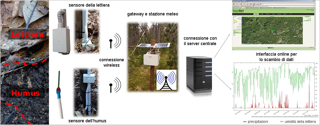 Il sistema è progettato per raccogliere dati tramite due tipi di sensori: uno posizionato nello strato della lettiera e l’altro nello strato di humus sottostante (Figura 2). Questi diversi tipi di combustibile nel suolo, rispettivamente di profondità, vengono utilizzati per ottenere un quadro completo del rischio di incendio. Livelli elevati di siccità nello strato della lettiera forniscono solo informazioni sul pericolo di innesco di un incendio boschivo, ma poco o nulla rivelano sulla sua velocità di propagazione e sulla possibile intensità.