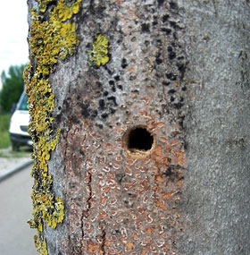 Fig. 4. Il grosso foro di sfarfallamento del Cerambice asiatico delle latifoglie, presenta un diametro di circa 1 cm. Foto: Doris Hölling (WSL)
