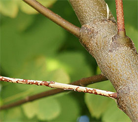 Fig. 3. Diverse specie di coleotteri, per completare la loro maturazione sessuale, necessitano di specifiche modalità di foraggiamento che comprendono sia le foglie, gli aghi, le gemme e la corteccia. I sintomi visibili su questo rametto di acero sono stati provocati dal cerambice asiatico delle latifoglie. Foto: Beat Forster (WSL)
