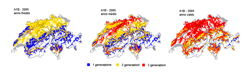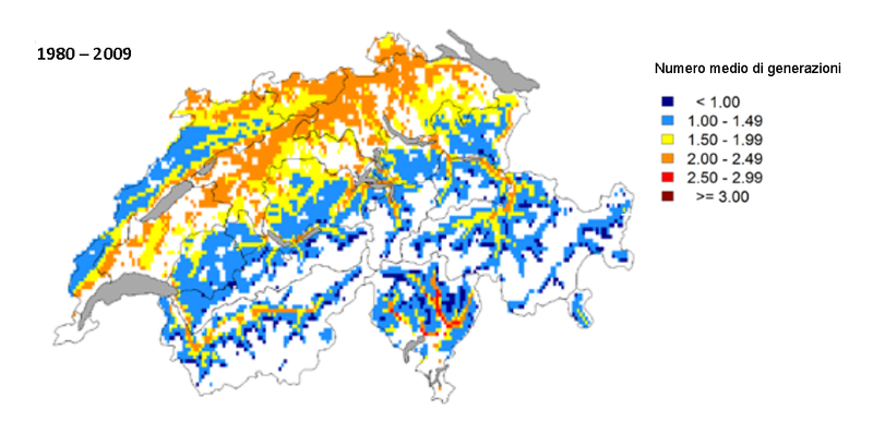 Nelle attuali condizioni climatiche, in un anno mediamente caldo il modello simula due generazioni nell’Altipiano svizzero e alle basse quote delle Alpi, una generazione sulle Alpi e alle alte quote del Giura (Fig. 2). In un anno freddo si può sviluppare in tutta la Svizzera, eccetto alle quote calde dell’Altipiano svizzero, una sola generazione. Durante il torrido 2003, in alcune parti dell’Altipiano svizzero è stata deposta una terza generazione. Esclusivamente alle alte quote e nei siti esposti a nord del Giura e delle Alpi si è sviluppata, come previsto dal modello, una sola generazione.