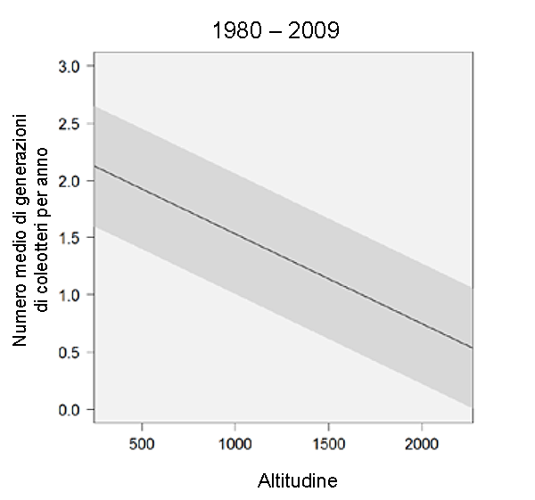 Fig. 2 - Numero medio di generazioni di coleotteri nelle attuali condizioni climatiche (1980-2009). In alto: distribuzione geografica del numero medio di generazioni deposte. Un valore ad es. di 1,50-1,99 significa che vengono più spesso depositate due generazioni che una. In basso: numero di generazioni in funzione dell’altitudine con fascia di previsione del 95%.