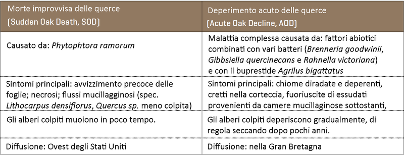Tab. 2 - Differenziazione tra la morte improvvisa delle querce (SOD) e il deperimento acuto delle querce (AOD).