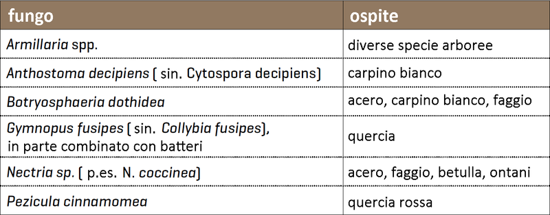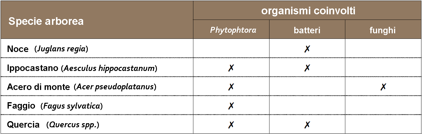 Tab. 1 - Specie arboree sulle quali negli ultimi anni sono stati osservate fuoriuscite di essudati, con i loro fattori biotici causali.