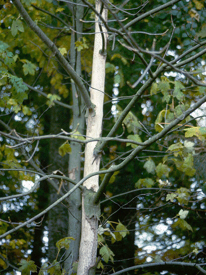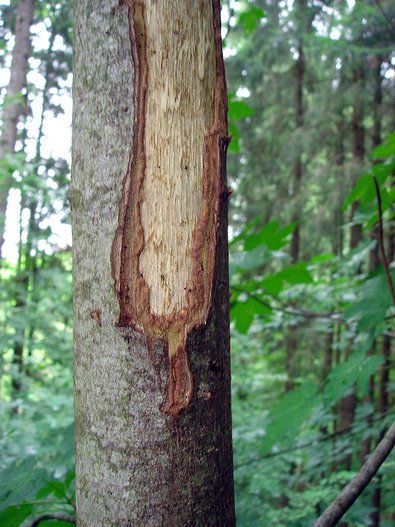 A causa del profilo diverso lasciato dalla dentatura sull'alburno degli aceri e delle specie a legno tenero, i danni da ghiro sono abbastanza facili da individuare (fig. 5). I denti dello scoiattoli infatti lasciano tracce che sono visibili soprattutto nei punti di attacco delle parti scortecciate. Sul faggio e sul carpino per contro, il ghiro lascia spesso tracce di denti poco visibili e che sui danni meno recenti sono difficilmente distinguibili da quelle lasciate dallo scoiattolo. I danni provocati dallo scoiattolo hanno spesso un'immagine spiraliforme che sale circondando l'intero tronco. Questa conformazione a spirale di regola non è osservabile nei danni causati dal ghiro.