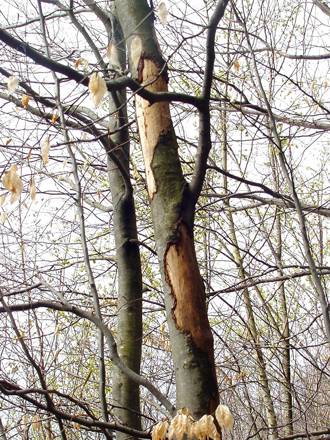 L'area danneggiata è larga quanto un dito o al massimo una mano e la corteccia viene spesso rosicchiata a chiazze (fig. 3). Danni piccoli e localizzati possono anche assumere la conformazione di un anello che circonda l'intero tronco. Danni a forma di spirale come quelli provocati dagli scoiattoli non sono caratteristici del ghiro. La scortecciatura avviene in particolare appena prima o appena dopo il letargo invernale.