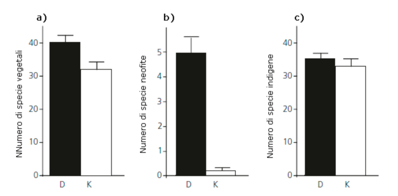 Fig. 5 - Numero di specie vegetali rilevate sulle discariche di residui vegetali (D) e sulle aree di controllo (K) nelle regione di Basilea. a) Numero totale di specie vegetali; b) Numero di specie neofite; c) Numero di specie indigene. I grafici indicano la media e la deviazione standard tra le 20 stazioni esaminate.