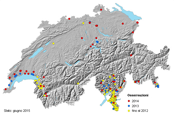 Fig. 3 - Distribuzione delle osservazioni del cinipide galligeno del castagno (Dryocosmus kuriphilus) nella Svizzera. Stato: giugno 2015.