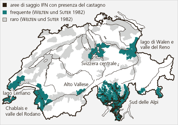 Fig. 4. Principali aree di distribuzione del castagno (Castanea sativa) in Svizzera.