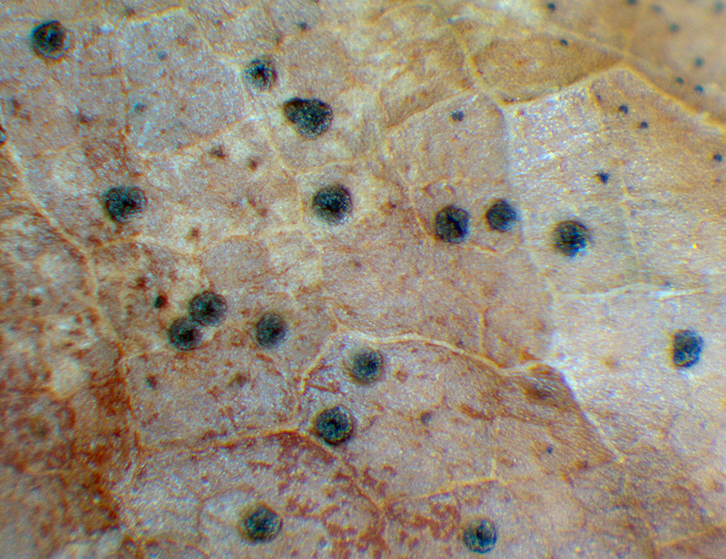 In inverno e in primavera, la forma sessuata del fungo si sviluppa sul terreno, nella lettiera e sulle foglie dell’anno precedente (fig. 3). Questi corpi fruttiferi lenticolari sono di colore marrone scuro o nero, di circa 0,2 mm di diametro e spesso concavi nel centro. Di solito, le foglie colpite si trovano nella parte inferiore dell’albero, o in giovani individui nel sottobosco.