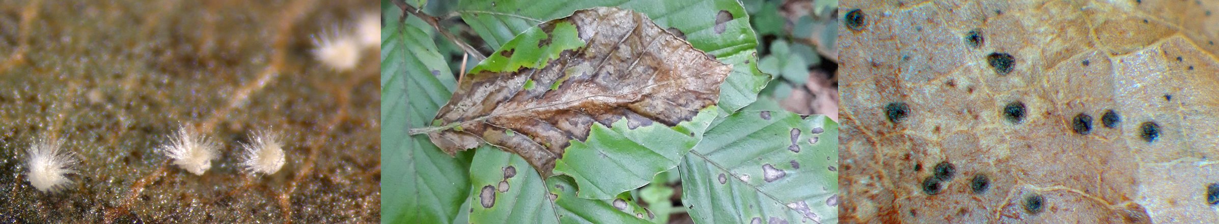 Le foglie colonizzate dal fungo sviluppano in seguito delle macchie marroni. Infine, su questo tessuto necrotico, si sviluppano, allo stadio di mycopappus, diverse piccole diaspore bianche (fig. 2). Questi corpi fruttiferi si formano dall’estate al tardo autunno (giugno-ottobre). Le diaspore asessuate, come i corpi fruttiferi, servono alla diffusione del fungo e portano a infezioni secondarie delle foglie dei faggi. L’infezione fogliare inizialmente viene favorita dalle giornate primaverili umide. Le estati umide possono invece favorire la diffusione asessuata del fungo tramite infezioni secondarie.