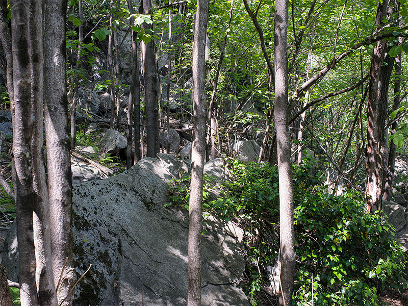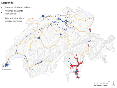 Le principali zone di presenza e diffusione dell’ailanto in Svizzera si trovano attualmente in Ticino e nelle regioni più miti dell’Altopiano, del Vallese e della Valle Anteriore del Reno. Nel resto della Svizzera nordalpina vi sono delle presenze significative soprattutto nei centri e sobborghi urbani (p. es. Basilea e Zurigo) e lungo le vie di comunicazione (fig. 4). I pochi popolamenti maturi di ailanto presenti in Svizzera si trovano su detriti di falda, stazioni dove la specie si dimostra particolarmente concorrenziale e a suo agio (fig. 5).