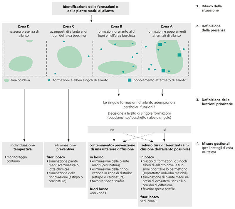 Fig. 7. Schema decisionale per la gestione differenziata delle formazioni di ailanto. Le opzioni gestionali sono descritte per ogni tipologia di presenza (zone A-D). I dettagli delle misure di gestione si trovano nellapubblicazione originale (PDF).