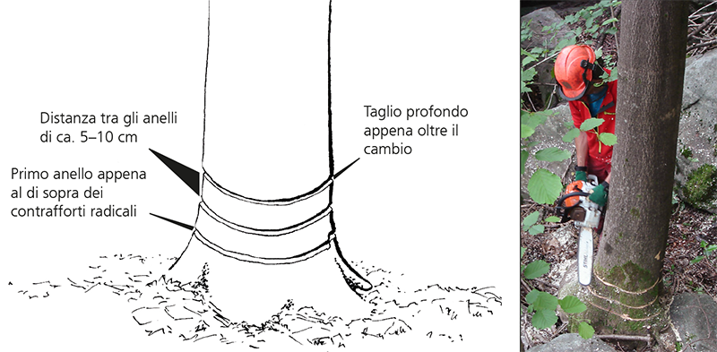 Per eliminare gli esemplari adulti di ailanto è consigliabile ricorrere alla cercinatura piuttosto che all’abbattimento degli alberi, in modo da ridurre il riscoppio vegetativo di polloni radicali e da ceppo. Per la cercinatura proponiamo un metodo sviluppato da Martin Ziegler (Capoufficio dell’Ufficio Forestale del Canton Zugo, 2020; fig. 9), che si è rivelato un metodo di controllo promettente, soprattutto per gli ailanti che crescono in bosco.
