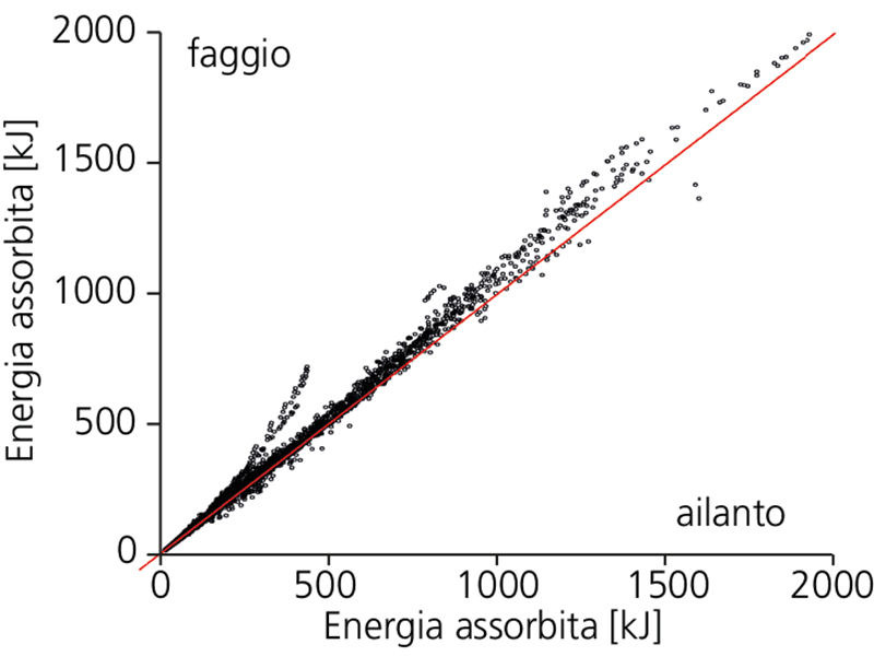 La capacità dell’ailanto di dissipare l’energia dei massi in caduta è paragonabile a quella del faggio (fig. 3a-c). La sua presenza non compromette quindi la potenziale capacità protettiva del bosco contro la caduta sassi. Nei popolamenti puri di ailanto il contributo del bosco all’ancoraggio radicale del terreno è invece minore rispetto a un castagneto o a una faggeta. La presenza di singoli ailanti adulti può comunque contribuire a diversificare la profondità di radicamento degli alberi e può così avere un effetto positivo sulla stabilità generale del suolo forestale contro le frane.