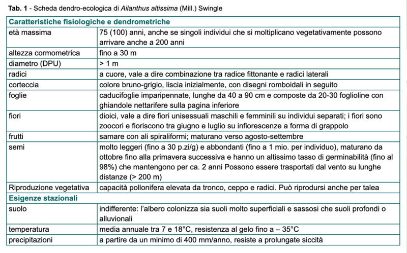 L’ailanto possiede molte caratteristiche ecologiche e dendrologiche tipiche delle specie pioniere (vedi Tabella 1). Oltre alla facilità di diffusione e di attecchimento dei semi, anche su suoli grezzi o rocciosi, il suo carattere pioniere si manifesta in fase giovanile anche in un’elevata allocazione di biomassa nel tronco e nelle radici con una conseguente rapida crescita in altezza (fino a 2m l’anno).