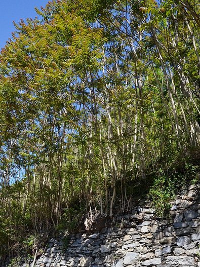 Nel Sud della Svizzera , a basse quote inferiori ai 1’000 m slm, l’ailanto si insinua spesso in popolamenti di latifoglie e di castagno in particolare, appena ceduati, percorsi dal fuoco, sofferenti per episodi di siccità (Fig. 2) o gravemente colpiti dal cinipide galligeno e dal cancro corticale. Una volta insediato in bosco, l’ailanto ha un sorprendente potenziale di rinnovazione anche in condizioni di penombra e sotto copertura, sia per via gamica, ma anche e soprattutto attraverso polloni radicali che si sviluppano nel sottobosco a partire dall’apparato radicale delle piante madri e che possono provocare danni in attesa di un’apertura accidentale del popolamento dominante. Fuori dal bosco in Ticino l’Ailanto si diffonde in particolare lungo le strade (Fig. 3) o le linee ferroviarie.