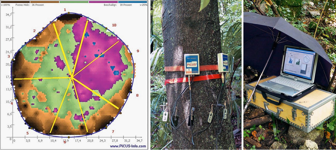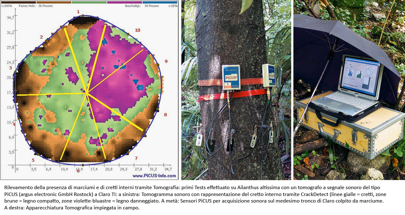 Fig. 7 - Rilevamento della presenza di marciumi e di cretti interni tramite Tomografia: primi Tests effettuato su Ailanthus altissima con un tomografo a segnale sonoro del tipo PiCUS (argus electronic GmbH Rostock) a Claro TI: a sinistra: Tomogramma sonoro con rappresentazione del cretto interno tramite CrackDetect (linee gialle = cretti, zone brune = legno compatto, zone violette-bluastre = legno danneggiato. A metà: Sensori PiCUS per acquisizione sonora sul medesimo tronco di Claro colpito da marciume. A destra: Apparecchiatura Tomografica impiegata in campo. Cliccare per ingrandire.