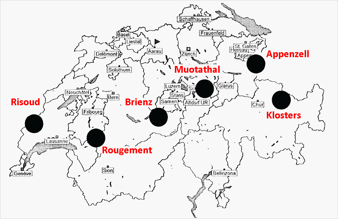 In Svizzera il legno di risonanza proviene principalmente dal Giura occidentale, dall'intero pendio esposto a Nord delle Alpi Grigionesi e in parte da alcune vallate del Ticino e del Vallese (v. Fig. 3). Un'analisi approfondita delle sei aree più conosciute per la fornitura di legname di risonanza (Fig. 5) mostra tra le altre cose che questo genere di legno cresce soprattutto sui versanti esposti a nord.