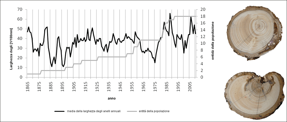 Le variazioni delle larghezze tra gli anelli, a volte piuttosto consistenti, sono principalmente dovute a ragioni climatiche. Tuttavia, i valori misurati lungo alcuni raggi contraddistinti dalla presenza di legno da compressione sono risultati alterati, con un effetto che ha quindi influito sui valori medi di tutti gli anelli, determinando quindi alcuni anelli annuali che mostrano anomalie positive (anelli più larghi).