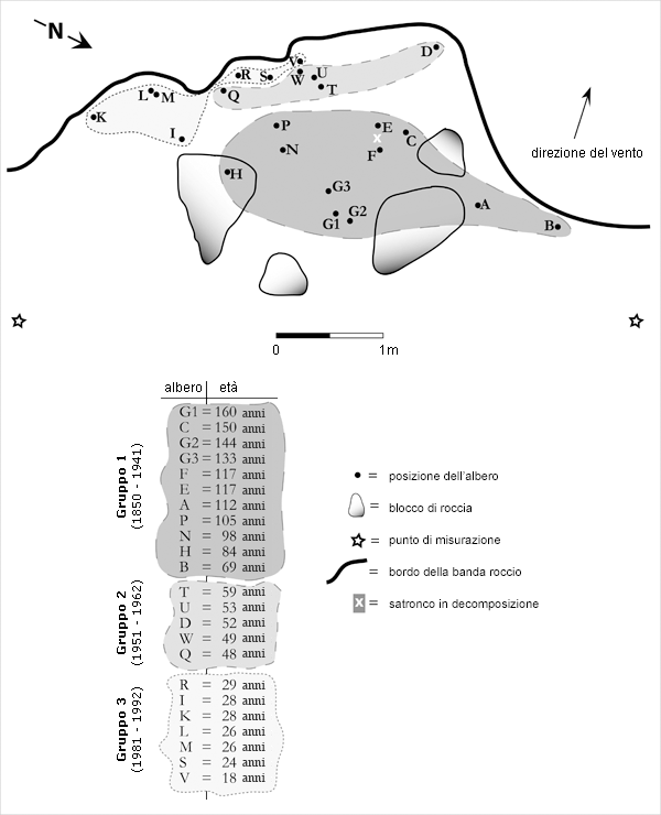 In un certo luogo favorevole al ringiovanimento, a partire dalla metà del 19° secolo, 23 alberi si sono insediati sopra ad una grossa lastra rocciosa. Al momento della loro mappatura nel 2011, essi avevano un'età compresa tra i 18 e i 160 anni. La maggior parte degli alberi erano attribuibili a tre gruppi di età (fig. 3). Era sorprendente costatare che i nuovi alberelli si sono insediati esclusivamente della parte inferiore del pendio, in posizione riparata e a ridosso degli alberi più vecchi. Determinanti sembravano essere la direzione del vento (che spirava verso nord-ovest) e l'esposizione del pendio.