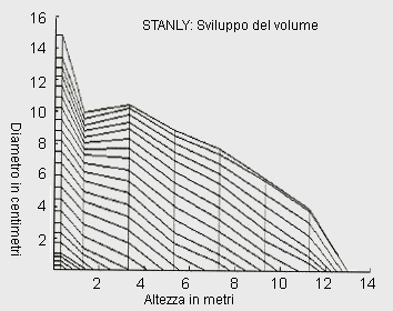 Figura 3 - Analisi di un fusto. Il diagramma indica lo sviluppo in altezza (asse verticale, in metri) e in diametro (asse orizzontale, in centimetri) di un abete rosso di 24 anni d’età. Fonte: applicazione Stanly © J. Nagel, NFV Göttingen