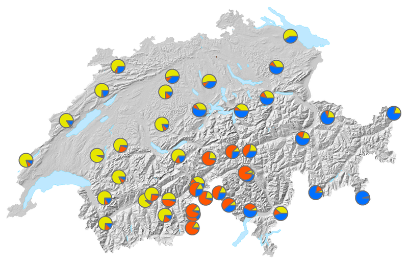 Fig. 3: Proporzioni dei tre gruppi di discendenza genetica presenti nei popolamenti svizzeri di abete bianco. Il gruppo occidentale (giallo) è probabilmente arrivato in Svizzera dalla Francia, quello orientale (blu) dai Balcani e quello meridionale (rosso) dall'Appennino settentrionale. Dati tratti da Folly e Gugerli 2013; Kramer 2020. grafico: WSL/Swisstopo