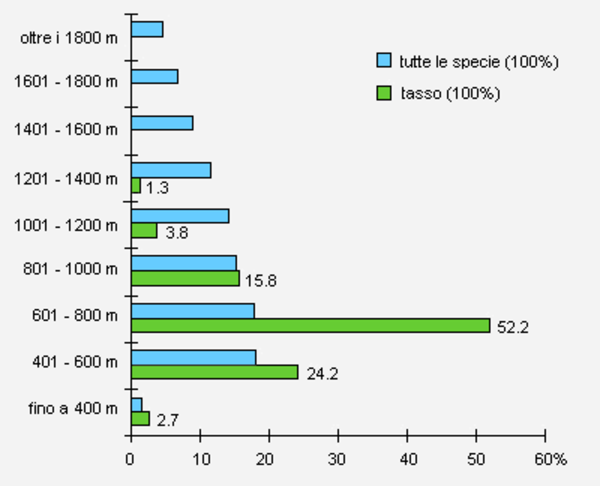 Figura 3 - Frequenza del numero di alberi di tasso in funzione dell'altitudine secondo il 1° IFN.
