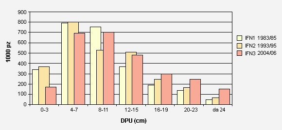 l problema della carenza di ringiovanimento del tasso può essere situato in termini temporali sulla base dei dati del 1° IFN del 1985. La distribuzione del numero di fusti per classe diametrica dell'IFN1 a partire da un DPU di 8 cm mostra un andamento caratterizzato da una diminuzione esponenziale in funzione del diametro, che è tipico di qualunque popolazione arborea (figura 6). La classe 4-7 cm non corrisponde più a questa funzione ed è "sotto-rappresentata".