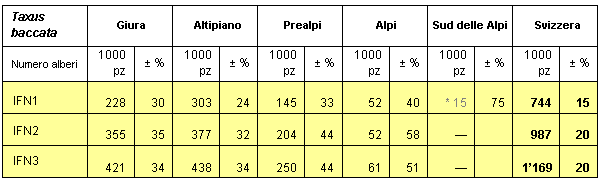 Sull'arco di circa 20 anni il numero di fusti di tasso con DPU di almeno 12 centimetri è cresciuto da 740'000 a 1'170'000 unità. L'incremento è più accentuato nel Giura e nelle Prealpi della Svizzera occidentale, oltre che nell'Altipiano orientale. Ancor più forte è stato l'aumento delle provvigioni di legname di tasso, volume in fusto con corteccia che è più che triplicato, passando dai 100'000 m3 del 1983/85 ai 139'000 m3 del 1993/95, fino agli attuali 354'000 m3, questo malgrado non di raro il tasso venga tutt'ora abbattuto e raccolto.