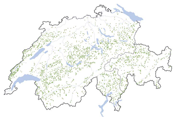 Esso è comunque raramente presente, o è assente su piccola scala, localmente nelle zone con scarsa piovosità del Giura e dell’Altipiano, come per esempio nei dintorni di Basilea o nelle zone alle basse quote dell’Altipiano occidentale (Fig. 2). Il suo areale di diffusione principale si trova nelle zone occidentali e centrali delle Alpi del margine settentrionale e del Giura, così come nel Basso Vallese. La percentuale maggiore di sorbi degli uccellatori, in termini di numero di alberi con DPU ≥ 12 cm, si trova nelle Alpi occidentali con l'1,8% (Fig. 3).