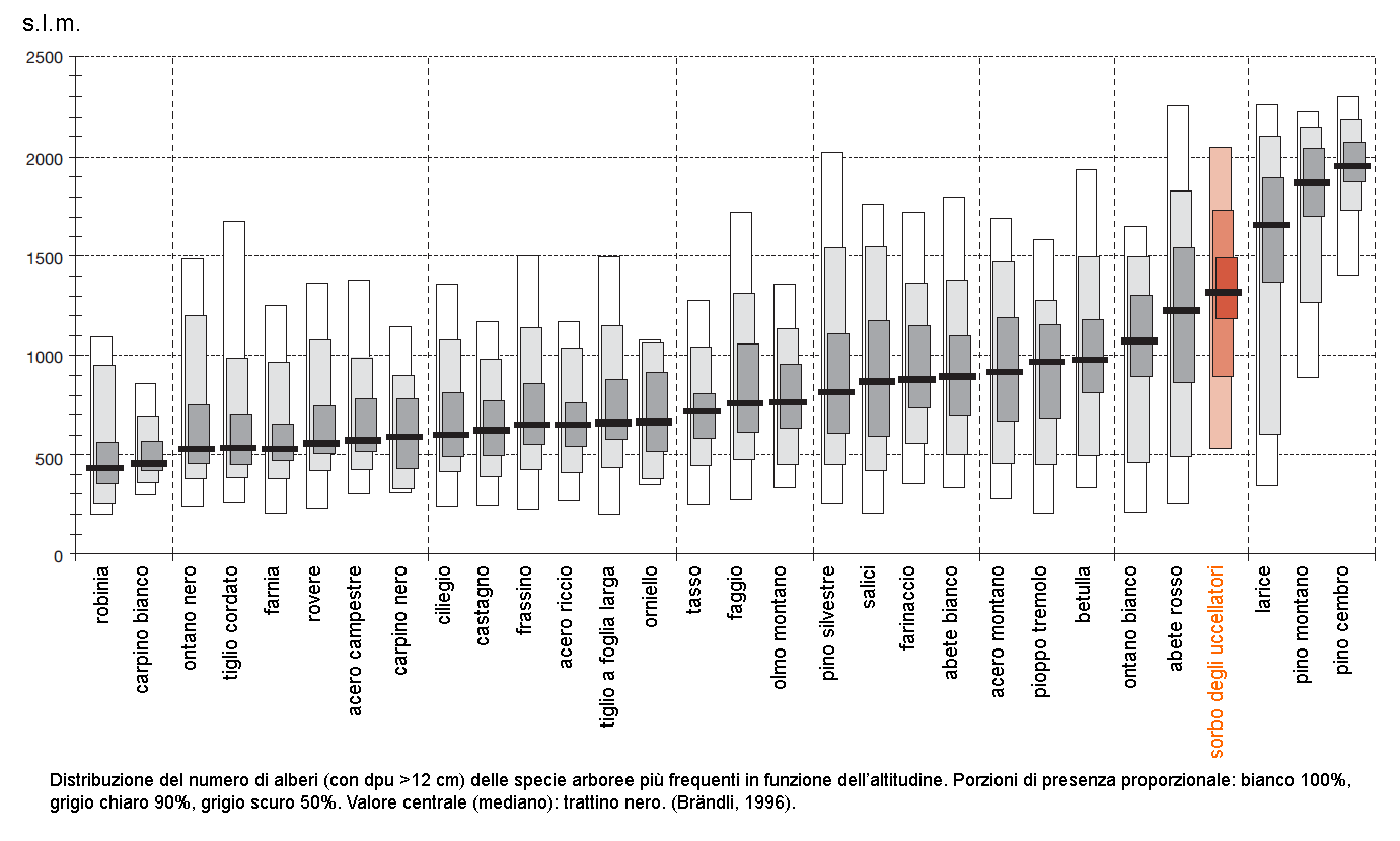 Il 90% dei sorbi degli uccellatori cresce nelle regioni montane superiori e subalpine inferiori, mentre la metà degli alberi di questa specie si trova al di sopra dei 1300 m s.l.m. (Fig. 4). L'area di saggio dell'Inventario Forestale Nazionale Svizzero IFN che si trova all’altitudine più elevata dove è stato rilevato il sorbo degli uccellatori si trova attualmente a 2167 m sul livello del mare, sopra Saas-Balen nel Vallese. Insieme all'ontano alpino (ontano verde), sembra che il sorbo degli uccellatori possa salire fino a un massimo di 2300 metri di quota. Tra le latifoglie è la specie che è maggiormente diffusa alle quote più elevate, trovandosi in classifica appena prima della betulla e dell'ontano bianco (Fig. 4). La presenza di questa specie pioniera che richiede molta luce, è in gran parte dovuta alla concorrenza. Essa ha una presenza proporzionalmente maggiore nelle foreste di montagna aperte e diradate, nelle foreste disetanee e irregolari, negli stadi di sviluppo del novelleto e della spessina e nelle fustaie omogenee uniformi, ma piuttosto rade e aperte.