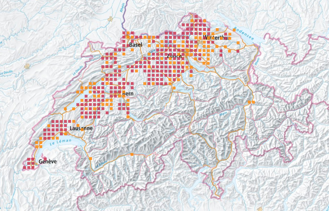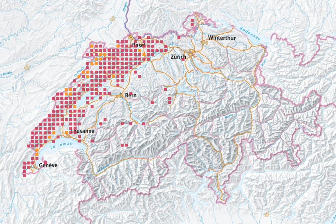 Distribuzione del rospo calamita (Epidalea calamita) in Svizzera. Punti rossi: dopo il 2010; punti arancioni: prima del 2010. © info fauna