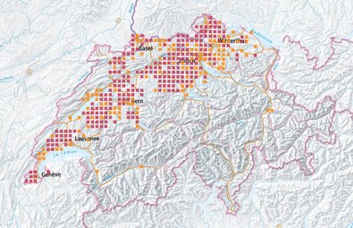 Le carte di distribuzione sono rappresentate utilizzando un reticolo di base a maglie quadrate di 5x5 km e si basano sulle informazioni costantemente attualizzate contenute nelle banche dati. La base dei dati varia notevolmente a seconda del gruppo di specie, per cui i record mancanti in un'area non significano necessariamente l'assenza di una specie, ma possono anche essere dovuti a lacune nella mappatura. La distribuzione degli uccelli è disponibile sul sito web della Stazione ornitologica svizzera di Sempach.